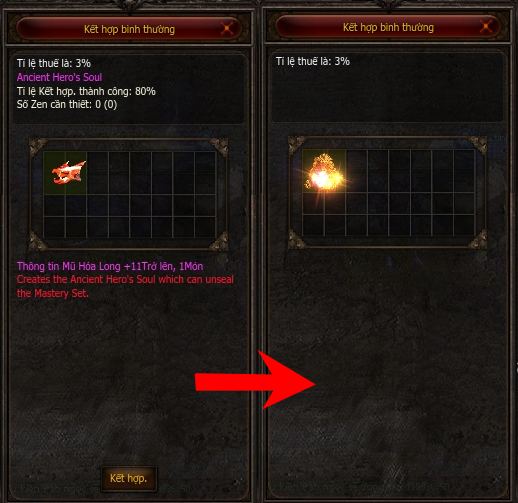 - Để chế tạo được những món đồ này, trước hết bạn cần chế tạo Linh hồn anh hùng, Linh hồn anh hùng được chế tạo từ đồ thần với tỷ lệ 80%.