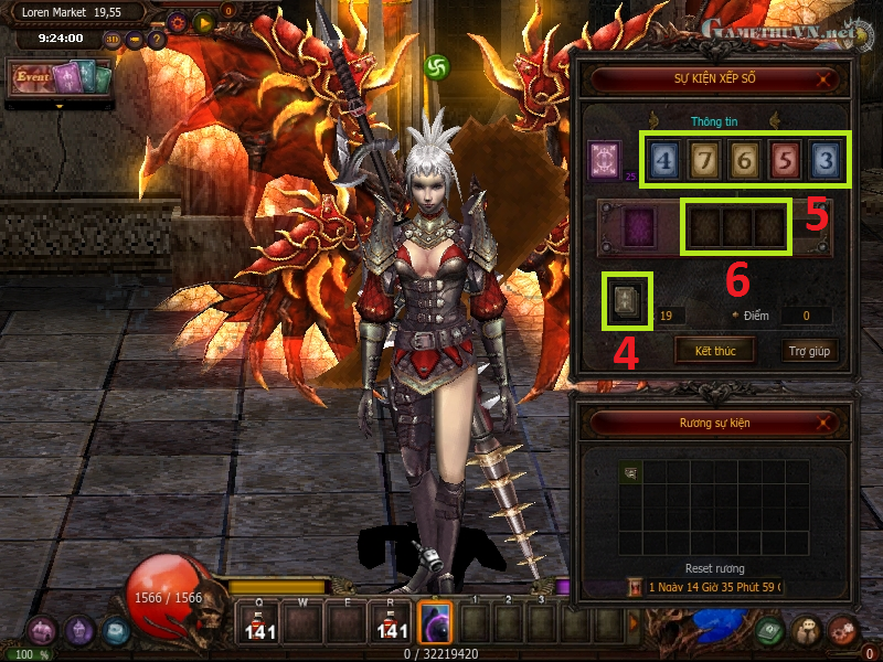 - Khi hết bài, bạn hãy bấm vào nút thả bài (số 4), Bạn kéo bài từ (số 5) xuống khu (số 4) để xếp, bạn bấm chuột phảui để hủy lá bài không mong muốn.