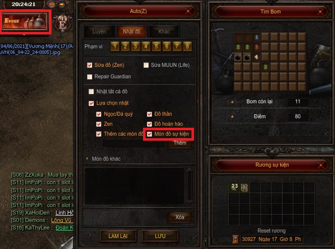 - Để có thể tham gia sự kiện gỡ bomb, bạn hãy thu thập vé sự kiện. Vé sẽ rơi trên các bạn đồ có sức mạnh tương đương Aida trở lên. Bấm Auto Z, phần nhặt đồ chọn "Món đồ sự kiện" để tự động nhặt vé, 24 vé Card Piece sẽ tạo thành 1 vé Card Deck. Mỗi một vé Card Deck bạn được 1 lượt chơi.
