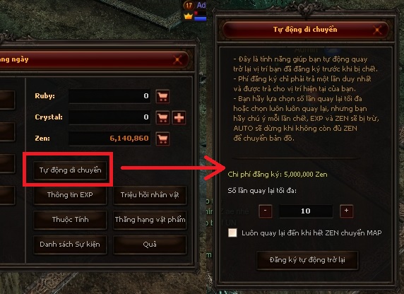 - Để sử dụng, các bạn bấm phím S, sau đó chọn Tự động di chuyển, một hội thoại sẽ hiện ra. Ở đây, bạn có thể thay đổi số lần quay trở lại tối đa, hoặc chọn vào dấu tích luôn luôn quay lại.