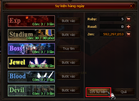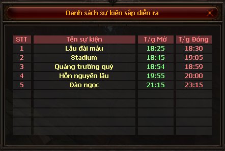 - Để xem thời gian của các sự kiện sắp điễn ra, bạn hãy về Lorencia và bấm phím S sau đó chọn danh sách sự kiện: